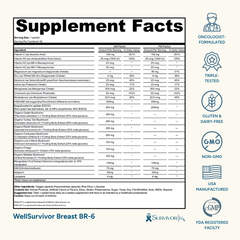 Every SurvivorRx product is developed with research-backed dosages, bioavailable forms, and survivor-specific needs in mind. In this video, our pharmacist and co-formulator, Karen May, walks through the science, care, and clinical reasoning behind how we build every formula—starting at the cellular level.